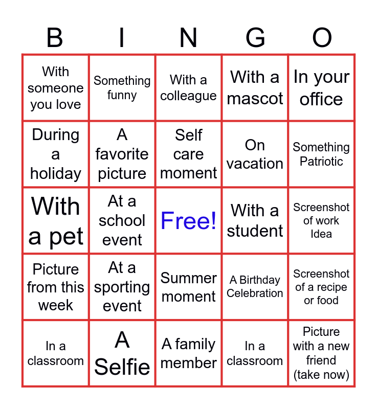 This bingo card has a free space and 24 words: In a classroom, At a sporting event, Self care moment, In a classroom, In your office, With someone you love, Something funny, With a colleague, With a student, Screenshot of work Idea, With a pet, A favorite picture, A Birthday Celebration, Screenshot of a recipe or food, During a holiday, A Selfie, A family member, With a mascot, Something Patriotic, Picture from this week, At a school event, Summer moment, On vacation and Picture with a new friend (take now).