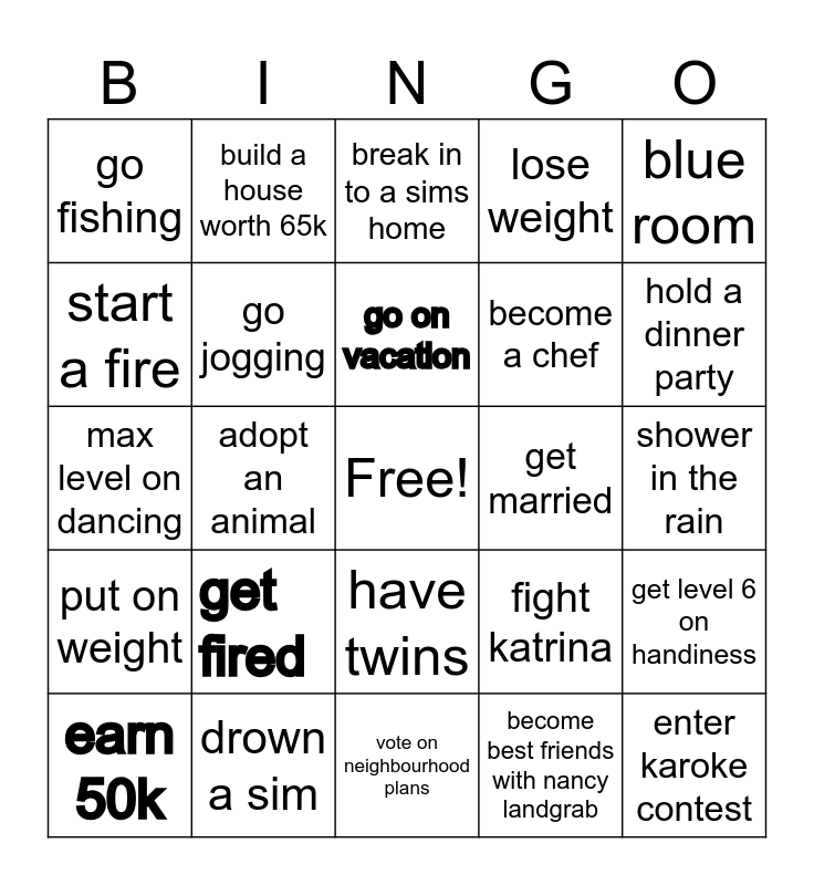 This bingo card has a free space and 24 words: get fired, drown a sim, go on vacation, earn 50k, blue room, go fishing, start a fire, build a house worth 65k, get married, have twins, become a chef, max level on dancing, fight katrina, get level 6 on handiness, go jogging, become best friends with nancy landgrab, shower in the rain, break in to a sims home, hold a dinner party, adopt an animal, enter karoke contest, put on weight, lose weight and vote on neighbourhood plans.
