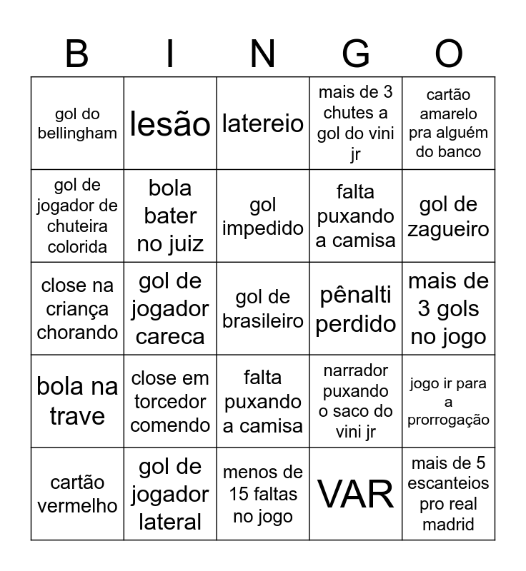 This bingo card has a free space and 34 words: gol de cabeça, VAR, gol de pé esquerdo, Citação ao Flamengo sem motivo, bola na trave, bola bater no juiz, cartão amarelo pra alguém do banco, cartão vermelho, lesão, concussão, gol impedido, latereio, comentário óbvio, gol de pênalti, pênalti perdido, gol de zagueiro, gol de jogador lateral, close na criança chorando, close em torcedor comendo, narrador puxando o saco do vini jr, falta puxando a camisa, gol do mbappe, gol do bellingham, mais de 3 gols no jogo, menos de 15 faltas no jogo, mais de 5 escanteios pro real madrid, mais de 3 chutes a gol do vini jr, estatística inútil, falta puxando a camisa, gol de jogador de chuteira colorida, gol de jogador com barba, gol de jogador careca, jogo ir para a prorrogação and técnico chutar garrafa/copo de água.