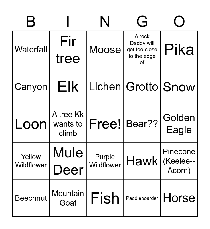 This bingo card has a free space and 29 words: Beechnut, Pine Tree, A tree Kk wants to climb, Creek, Waterfall, Moose, Elk, Mule Deer, Bear??, Mountain Goat, Golden Eagle, Horse, Fish, Paddleboarder, Snow, Lake, Purple Wildflower, Yellow Wildflower, Pika, Loon, Hawk, Campground, Grotto, Canyon, A rock Daddy will get too close to the edge of, Fir tree, Pinecone (Keelee--Acorn), Lichen and Moss.
