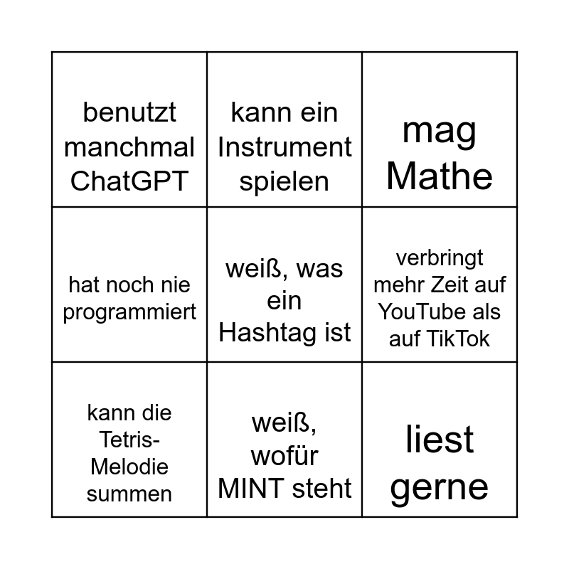 This bingo card has 18 words: weiß, wer Ada Lovelace ist, kennt einen Unterschied zwischen deutschen und englischen Tatstaturen, mag Mathe, benutzt manchmal ChatGPT, weiß schon, was eine for-Schleife ist, hat noch nie programmiert, kann die C-Dur-Tonleiter aufsagen, kann ein Instrument spielen, weiß, wofür MINT steht, liest gerne, hat eine tägliche Handy-Bildschirmzeit von über einer Stunde, weiß, was ein Hashtag ist, kennt Ihre Telefonnummer nicht auswendig, verbringt mehr Zeit auf YouTube als auf TikTok, kann die Tetris-Melodie summen, hat einen Instagram-Account, weiß, was ein Arduino ist and ist heute mit dem Fahrrad hergekommen.