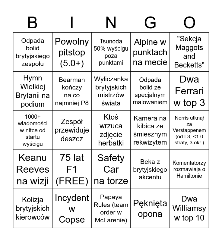 This bingo card has a free space and 24 words: 75 lat F1 (FREE), Incydent w Copse, Wyliczanka brytyjskich mistrzów świata, Kolizja brytyjskich kierowców, "Sekcja Maggots and Becketts", Odpada bolid brytyjskiego zespołu, Hymn Wielkiej Brytanii na podium, Powolny pitstop (5.0+), Kamera na kibica ze śmiesznym rekwizytem, Safety Car na torze, Odpada bolid ze specjalnym malowaniem, 1000+ wiadomości w nitce od startu wyścigu, Beka z brytyjskiego akcentu, Komentatorzy rozmawiają o Hamiltonie, Bearman kończy na co najmniej P8, Pęknięta opona, Norris utknął za Verstappenem (od L3, <1.0 straty, 3 okr.), Tsunoda 50% wyścigu poza punktami, Dwa Ferrari w top 3, Zespół przewiduje deszcz, Dwa Williamsy w top 10, Keanu Reeves na wizji, Alpine w punktach na mecie and Papaya Rules (team order w McLarenie).