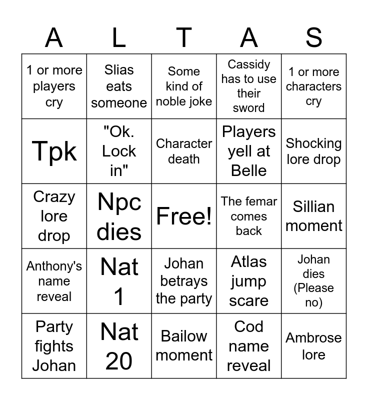 This bingo card has a free space and 24 words: Nat 1, Nat 20, Character death, Party fights Johan, 1 or more characters cry, 1 or more players cry, Tpk, Slias eats someone, The femar comes back, Johan betrays the party, Players yell at Belle, Crazy lore drop, Atlas jump scare, Johan dies (Please no), "Ok. Lock in", Cod name reveal, Sillian moment, Some kind of noble joke, Shocking lore drop, Npc dies, Ambrose lore, Anthony's name reveal, Cassidy has to use their sword and Bailow moment.