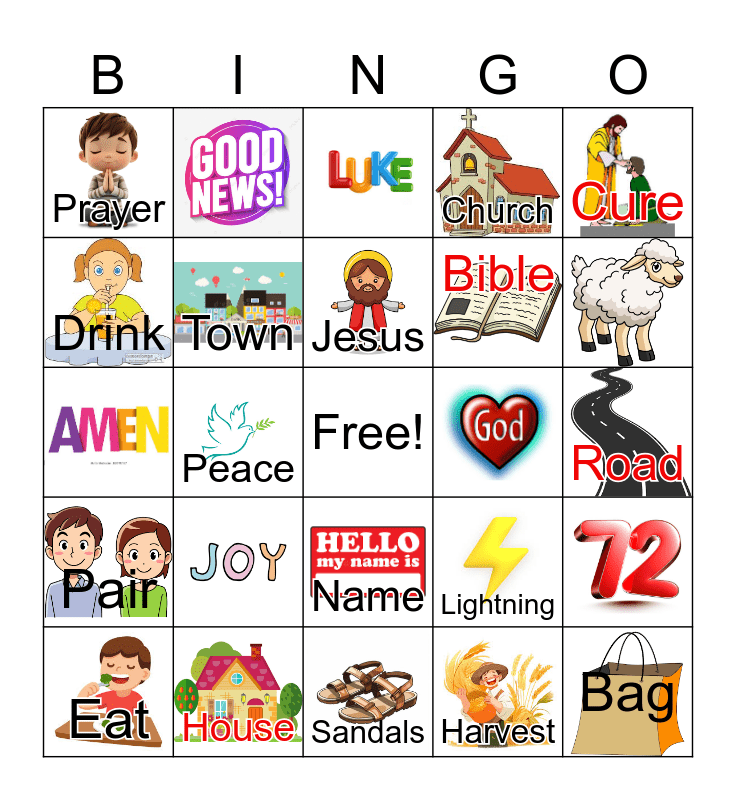 This bingo card has 28 images, a free space and 20 words: Dust, Bible, Harvest, Drink, Pair, Eat, Church, House, Sandals, Listen, Town, Jesus, Name, Prayer, Disciples, Bag, Peace, Road, Lightning and Cure.