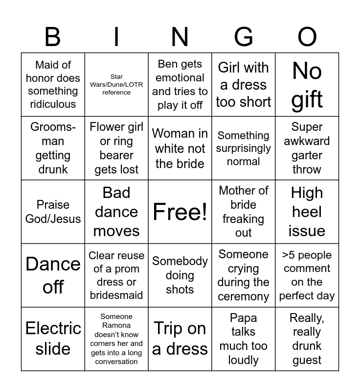 This bingo card has a free space and 39 words: Wardrobe malfunction, Bride over reacting, Some weird European thing, Flower girl or ring bearer gets lost, Electric slide, Somebody doing shots, Woman in white not the bride, Cake smash in face, No gift, Dance off, Bad dance moves, Girl with a dress too short, Really, really drunk guest, High heel issue, Mother of bride freaking out, Clear reuse of a prom dress or bridesmaid, Awkward / bad best man speech, Maid of honor does something ridiculous, Flowers get caught, Someone crying during the ceremony, Grooms-man getting drunk, Trip on a dress, Something surprisingly normal, Super awkward garter throw, Papa almost falls down, “Jesus just” “just Jesus” “father god”, Wedding starts late, >3 prayers at the reception, Nana complains about food temperature, Star Wars/Dune/LOTR reference, Ellie laughs during ceremony, Sarah cries, Ben gets emotional and tries to play it off, Someone Ramona doesn’t know corners her and gets into a long conversation, Papa talks much too loudly, Papa’s pants get dirty because of Trevor, >5 people comment on the perfect day, Praise God/Jesus and Nana says something out of pocket.
