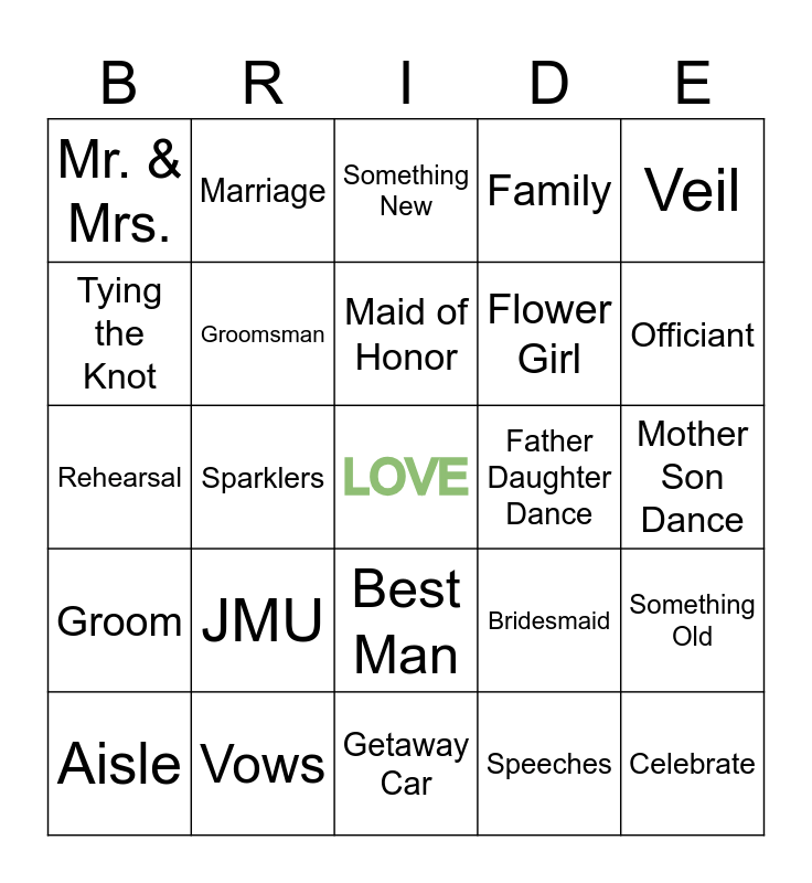 This bingo card has a free space and 41 words: I Do, Rehearsal, Dress, Groomsman, Vows, Best Man, Maid of Honor, Church, Veil, Groom, Sparklers, Family, Celebrate, Mother Son Dance, Father Daughter Dance, JMU, Toasts, Mr. & Mrs., Wife, Something New, Something Old, Something Blue, Getaway Car, Flower Girl, Ring Bearer, Cake, Speeches, Rings, Officiant, Bouquet, UVA, Marriage, Aisle, Kiss the Bride, Bridesmaid, Tying the Knot, First Dance, Newlyweds, Honeymoon, Husband and Wedding Shower.