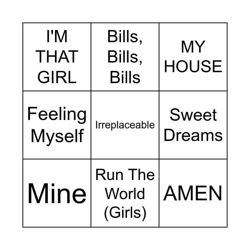 This bingo card has 20 words: MOVE, OH LOUISIANA, MY HOUSE, FLAMENCO, TYRANT, Irreplaceable, Dance for You, I'M THAT GIRL, AMEN, Bills, Bills, Bills, Naughty Girl, Me, Myself And I, Sweet Dreams, 7/11, Mine, Partition, Run The World (Girls), Feeling Myself, XO and The Closer I Get to You.