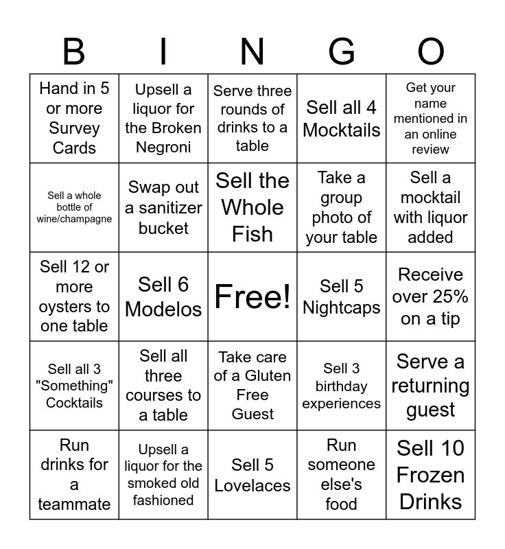 This bingo card has a free space and 24 words: Sell all three courses to a table, Upsell a liquor for the smoked old fashioned, Sell the Whole Fish, Run drinks for a teammate, Get your name mentioned in an online review, Hand in 5 or more Survey Cards, Sell a whole bottle of wine/champagne, Upsell a liquor for the Broken Negroni, Sell 5 Nightcaps, Take care of a Gluten Free Guest, Take a group photo of your table, Sell 12 or more oysters to one table, Sell 3 birthday experiences, Serve a returning guest, Swap out a sanitizer bucket, Run someone else's food, Receive over 25% on a tip, Serve three rounds of drinks to a table, Sell a mocktail with liquor added, Sell 6 Modelos, Sell 10 Frozen Drinks, Sell all 3 "Something" Cocktails, Sell all 4 Mocktails and Sell 5 Lovelaces.