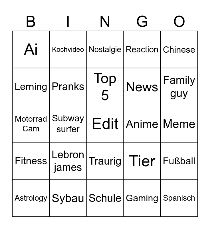 This bingo card has a free space and 24 words: Lebron james, Sybau, Top 5, Astrology, Chinese, Ai, Lerning, Kochvideo, Anime, Traurig, News, Motorrad Cam, Tier, Fußball, Pranks, Gaming, Meme, Nostalgie, Family guy, Subway surfer, Spanisch, Fitness, Reaction and Schule.
