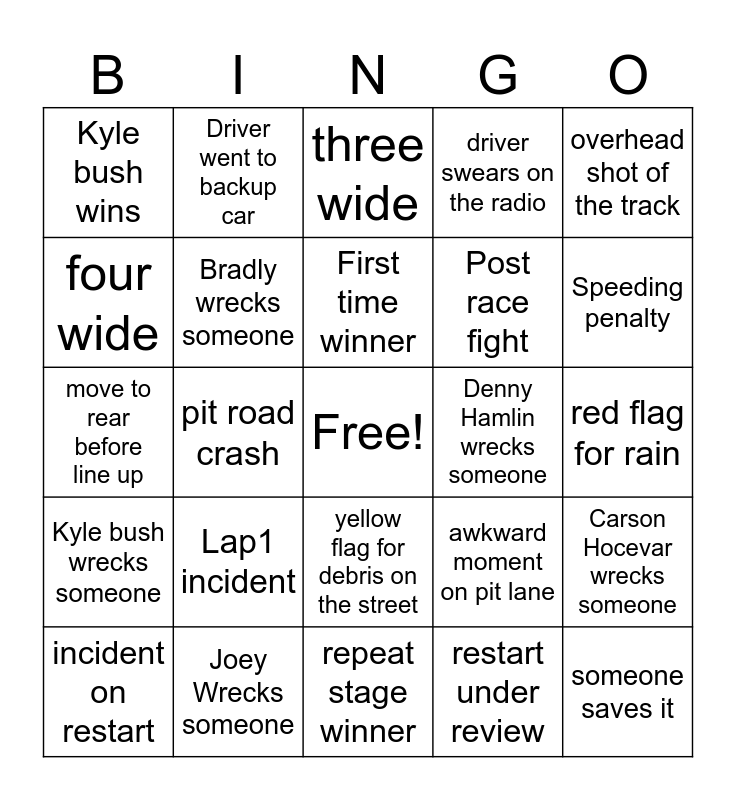 This bingo card has a free space and 24 words: Lap1 incident, Joey Wrecks someone, First time winner, incident on restart, overhead shot of the track, Kyle bush wins, four wide, Driver went to backup car, Denny Hamlin wrecks someone, yellow flag for debris on the street, Post race fight, move to rear before line up, awkward moment on pit lane, Carson Hocevar wrecks someone, Bradly wrecks someone, restart under review, red flag for rain, three wide, Speeding penalty, pit road crash, someone saves it, Kyle bush wrecks someone, driver swears on the radio and repeat stage winner.