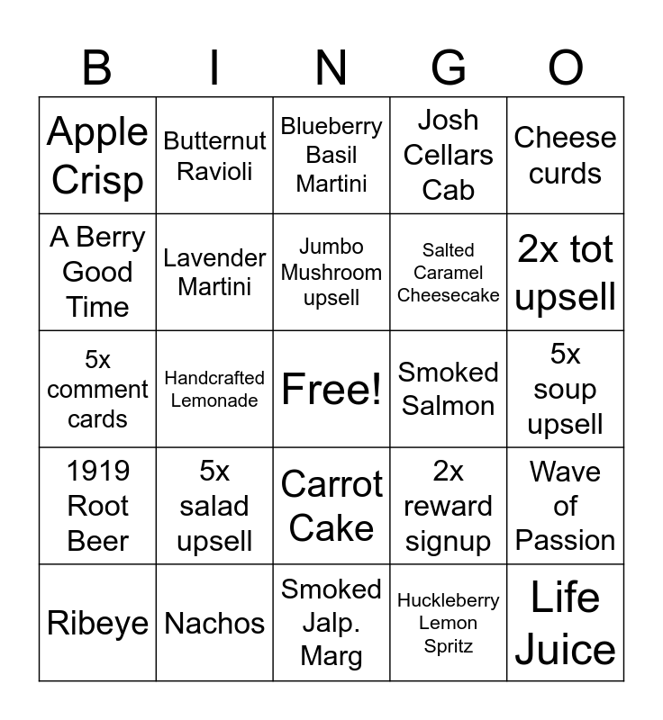 This bingo card has a free space and 24 words: 5x salad upsell, Nachos, Jumbo Mushroom upsell, Ribeye, Cheese curds, Apple Crisp, A Berry Good Time, Butternut Ravioli, Smoked Salmon, Carrot Cake, Salted Caramel Cheesecake, 5x comment cards, 2x reward signup, Wave of Passion, Lavender Martini, Huckleberry Lemon Spritz, 5x soup upsell, Blueberry Basil Martini, 2x tot upsell, Handcrafted Lemonade, Life Juice, 1919 Root Beer, Josh Cellars Cab and Smoked Jalp. Marg.