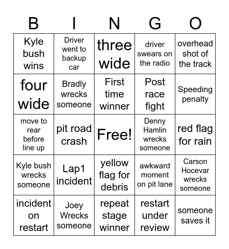 This bingo card has a free space and 24 words: Lap1 incident, Joey Wrecks someone, First time winner, incident on restart, overhead shot of the track, Kyle bush wins, four wide, Driver went to backup car, Denny Hamlin wrecks someone, yellow flag for debris, Post race fight, move to rear before line up, awkward moment on pit lane, Carson Hocevar wrecks someone, Bradly wrecks someone, restart under review, red flag for rain, three wide, Speeding penalty, pit road crash, someone saves it, Kyle bush wrecks someone, driver swears on the radio and repeat stage winner.