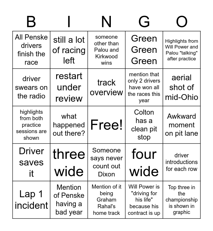 This bingo card has a free space and 24 words: three wide, Mention of Penske having a bad year, track overview, Lap 1 incident, Highlights from Will Power and Palou "talking" after practice, All Penske drivers finish the race, driver swears on the radio, still a lot of racing left, Colton has a clean pit stop, Someone says never count out Dixon, mention that only 2 drivers have won all the races this year, highlights from both practice sessions are shown, four wide, driver introductions for each row, restart under review, Will Power is "driving for his life" because his contract is up, Awkward moment on pit lane, someone other than Palou and Kirkwood wins, aerial shot of mid-Ohio, what happened out there?, Top three in the championship is shown in graphic, Driver saves it, Green Green Green and Mention of it being Graham Rahal's home track.