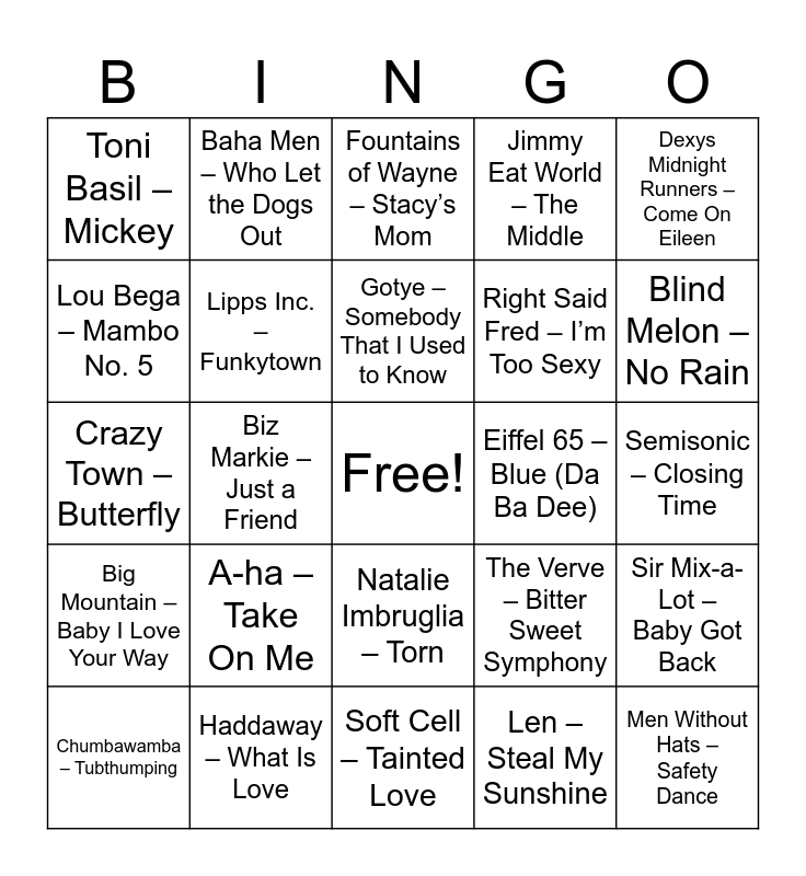 This bingo card has a free space and 25 words: A-ha – Take On Me, Soft Cell – Tainted Love, Gotye – Somebody That I Used to Know, Chumbawamba – Tubthumping, Dexys Midnight Runners – Come On Eileen, Toni Basil – Mickey, Lou Bega – Mambo No. 5, Baha Men – Who Let the Dogs Out, Eiffel 65 – Blue (Da Ba Dee), Natalie Imbruglia – Torn, Right Said Fred – I’m Too Sexy, Crazy Town – Butterfly, The Verve – Bitter Sweet Symphony, Sir Mix-a-Lot – Baby Got Back, Lipps Inc. – Funkytown, Vanilla Ice – Ice Ice Baby, Semisonic – Closing Time, Fountains of Wayne – Stacy’s Mom, Blind Melon – No Rain, Biz Markie – Just a Friend, Men Without Hats – Safety Dance, Haddaway – What Is Love, Big Mountain – Baby I Love Your Way, Jimmy Eat World – The Middle and Len – Steal My Sunshine.