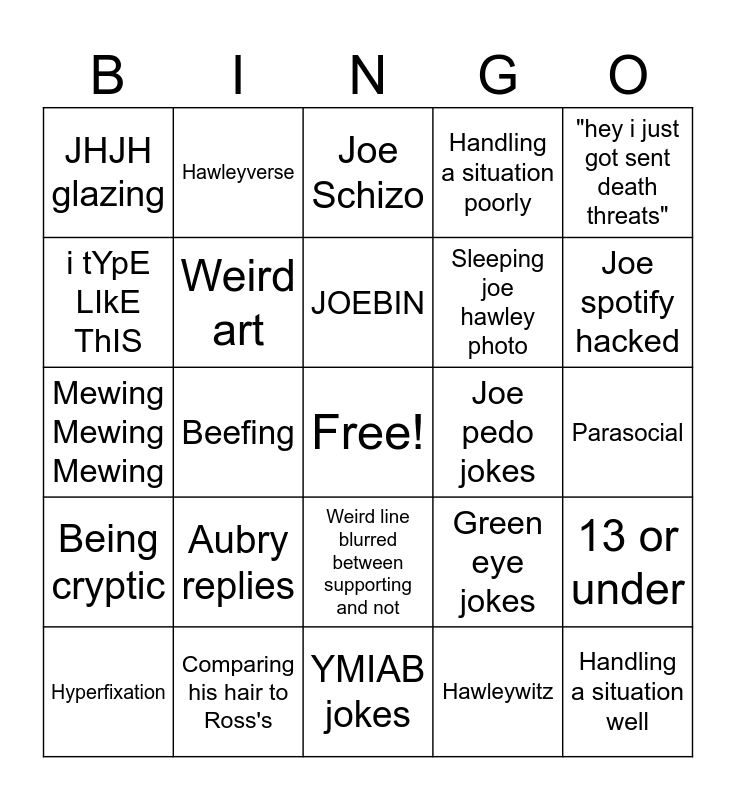 This bingo card has a free space and 37 words: Joe supporter, Joe denier, Joe glazer, Weird art, 13 or under, Aubry replies, JOEBIN, Joe hawley is cute, "hey i just got sent death threats", Nat sucks, Beefing, Handling a situation poorly, Handling a situation well, Parasocial, i tYpE LIkE ThIS, Being cryptic, "weird bed is a confession", Joe Schizo, Weird line blurred between supporting and not, Joe pedo jokes, JHJH glazing, Joe spotify hacked, Hyperfixation, YMIAB jokes, I hate cantortwt, Hawleywitz, Hawleyverse, Salad, Hpii glazing, Sexualizing joe, Cheek bone jokes, Comparing his hair to Ross's, Mewing Mewing Mewing, Wizard jokes, Green eye jokes, Sleeping joe hawley photo and Kalypso.