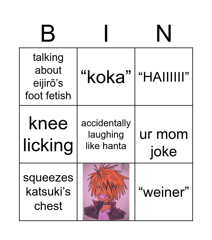 This bingo card has 1 images and 8 words: squeezes katsuki’s chest, “HAIIIIII”, “koka”, knee licking, talking about eijirō’s foot fetish, ur mom joke, accidentally laughing like hanta and “weiner”.