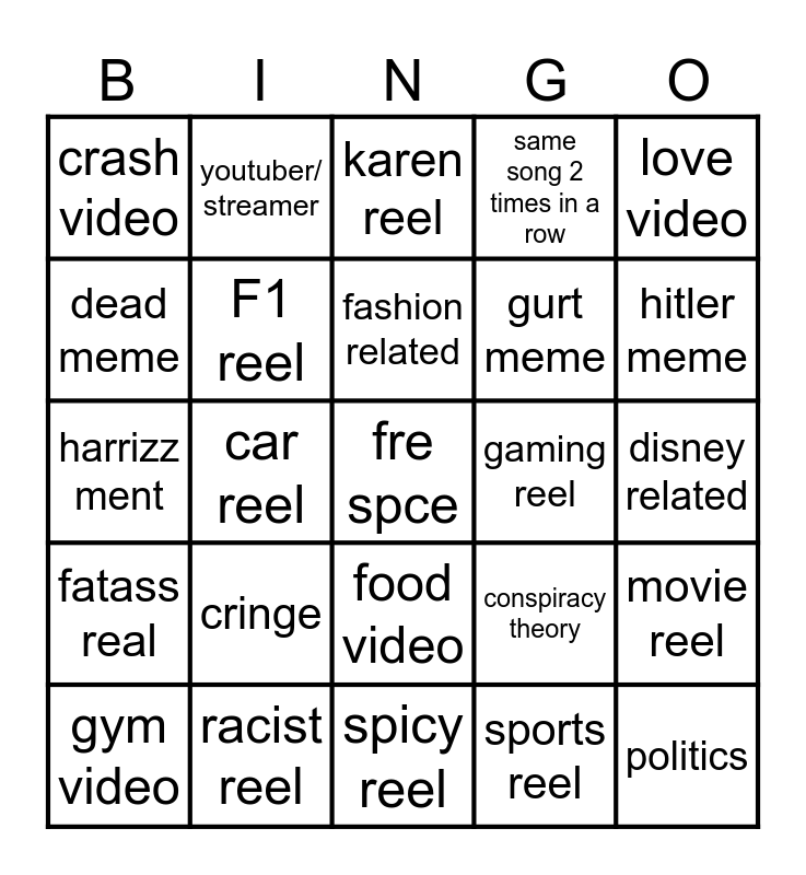 This bingo card has a free space and 24 words: cringe, racist reel, fashion related, gym video, love video, crash video, dead meme, youtuber/ streamer, gaming reel, food video, gurt meme, harrizz ment, conspiracy theory, movie reel, F1 reel, sports reel, disney related, karen reel, hitler meme, car reel, politics, fatass real, same song 2 times in a row and spicy reel.