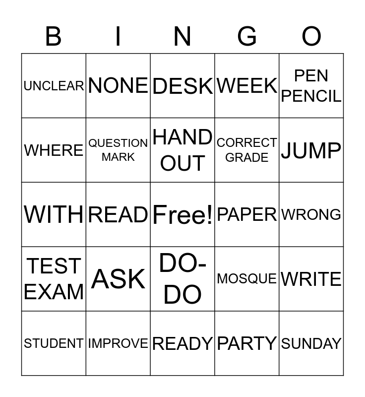 This bingo card has a free space and 24 words: ASK, IMPROVE, HAND OUT, STUDENT, PEN PENCIL, UNCLEAR, WHERE, NONE, PAPER, DO-DO, CORRECT GRADE, WITH, MOSQUE, WRITE, QUESTION MARK, PARTY, WRONG, DESK, JUMP, READ, SUNDAY, TEST EXAM, WEEK and READY.