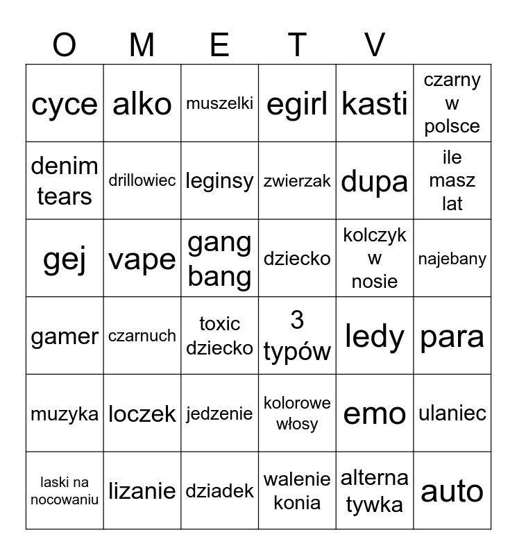 This bingo card has 36 words: kolorowe włosy, jedzenie, walenie konia, denim tears, gamer, dziecko, drillowiec, dziadek, kasti, emo, ile masz lat, egirl, ulaniec, vape, zwierzak, cyce, muzyka, kolczyk w nosie, gej, muszelki, gang bang, czarnuch, 3 typów, toxic dziecko, ledy, alko, dupa, lizanie, leginsy, czarny w polsce, auto, laski na nocowaniu, para, najebany, loczek and alterna tywka.