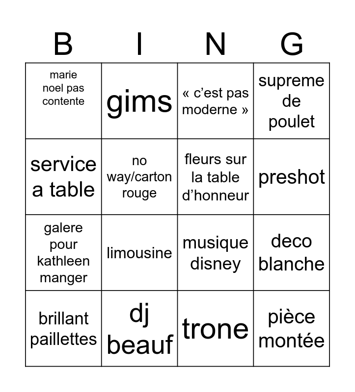 This bingo card has 16 words: brillant paillettes, dj beauf, « c’est pas moderne », supreme de poulet, service a table, gims, musique disney, deco blanche, marie noel pas contente, no way/carton rouge, trone, preshot, galere pour kathleen manger, limousine, fleurs sur la table d’honneur and pièce montée.