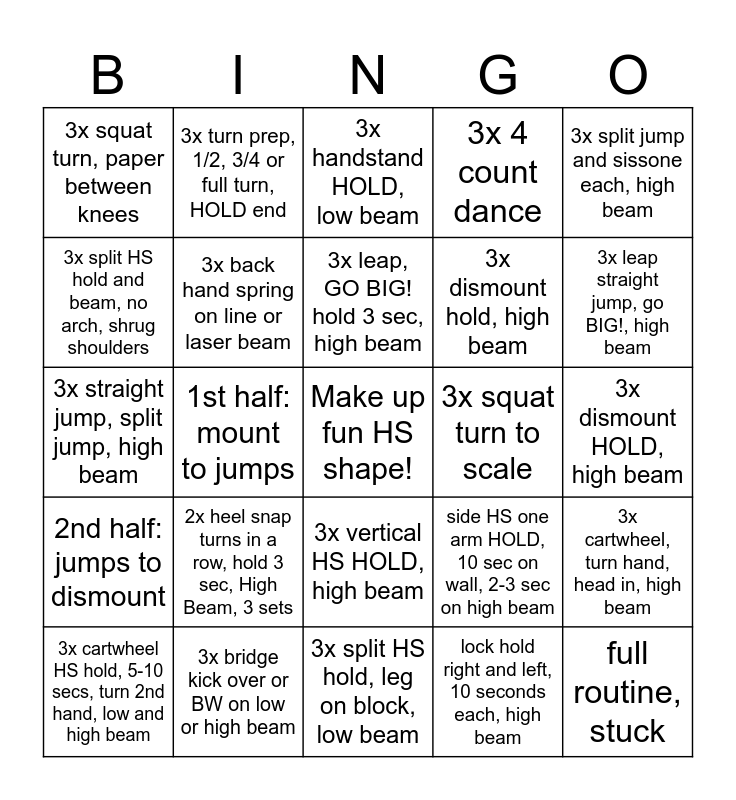 This bingo card has a free space and 24 words: 2x heel snap turns in a row, hold 3 sec, High Beam, 3 sets, 3x bridge kick over or BW on low or high beam, 3x leap, GO BIG! hold 3 sec, high beam, 3x cartwheel HS hold, 5-10 secs, turn 2nd hand, low and high beam, 3x split jump and sissone each, high beam, 3x squat turn, paper between knees, 3x split HS hold and beam, no arch, shrug shoulders, 3x turn prep, 1/2, 3/4 or full turn, HOLD end, 3x squat turn to scale, 3x vertical HS HOLD, high beam, 3x dismount hold, high beam, 3x straight jump, split jump, high beam, side HS one arm HOLD, 10 sec on wall, 2-3 sec on high beam, 3x cartwheel, turn hand, head in, high beam, 3x back hand spring on line or laser beam, lock hold right and left, 10 seconds each, high beam, 3x dismount HOLD, high beam, 3x handstand HOLD, low beam, 3x leap straight jump, go BIG!, high beam, 1st half: mount to jumps, full routine, stuck, 2nd half: jumps to dismount, 3x 4 count dance and 3x split HS hold, leg on block, low beam.