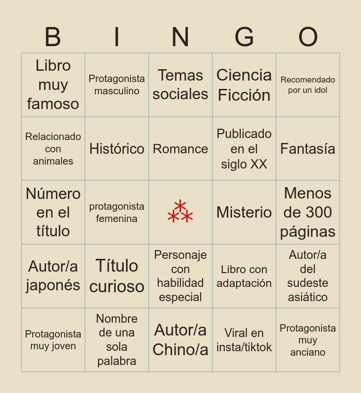 This bingo card has a free space and 24 words: Título curioso, Nombre de una sola palabra, Romance, Protagonista muy joven, Recomendado por un idol, Libro muy famoso, Relacionado con animales, Protagonista masculino, Misterio, Personaje con habilidad especial, Publicado en el siglo XX, Número en el título, Libro con adaptación, Autor/a del sudeste asiático, Histórico, Viral en insta/tiktok, Menos de 300 páginas, Temas sociales, Fantasía, protagonista femenina, Protagonista muy anciano, Autor/a japonés, Ciencia Ficción and Autor/a Chino/a.