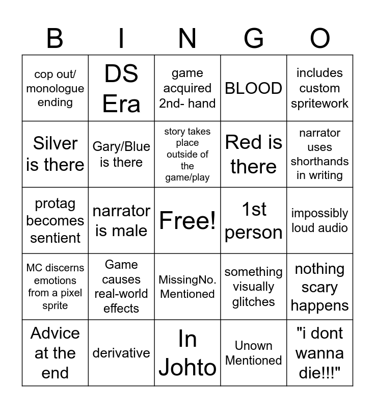 This bingo card has a free space and 52 words: MC/Protag makes a stupid decision, "i dont wanna die!!!", In Kanto, In Johto, Game causes real-world effects, GBA era, DS Era, Gold is there, Silver is there, Mewtwo Mentioned, Gary/Blue is there, poor formatting, nothing scary happens, something visually glitches, menu options altered, XTREMELY SPECIFIC INFO, story takes place outside of the game/play, 1st person, includes custom art or fanart, includes custom spritework, narrator is male, Unown Mentioned, cop out/ monologue ending, Red is there, narrator is female, 3rd person, something not well described ("it...", "something"), tense changes, narrator uses shorthands in writing, obtains mon off GTS, poorly written, BLOOD, swearing, gorey details, game is messed up, game acquired 2nd- hand, derivative, Lavender Town Mentioned, game shuts off on its own, "save data lost or corrupted", Unable to access previous save file, impossibly loud audio, MC discerns emotions from a pixel sprite, Charizard Mentioned, MissingNo. Mentioned, character dies/ is killed, MC checks trainer card, protag becomes sentient, 4th wall break, MC omnipotence, Advice at the end and music stops or slows.