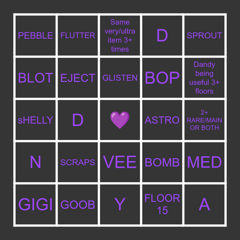 This bingo card has a free space and 24 words: SCRAPS, GOOB, GLISTEN, GIGI, SPROUT, PEBBLE, BLOT, FLUTTER, ASTRO, VEE, BOP, sHELLY, BOMB, MED, EJECT, FLOOR 15, 2+ RARE/MAIN OR BOTH, Same very/ultra item 3+ times, Dandy being useful 3+ floors, D, A, N, D and Y.