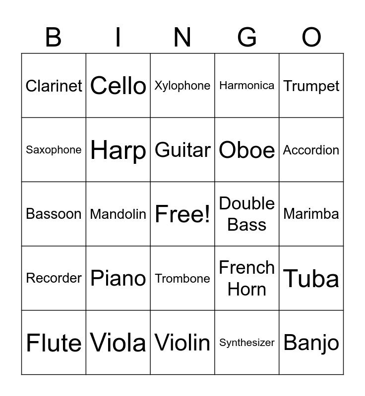 This bingo card has a free space and 25 words: Piano, Violin, Guitar, Flute, Trumpet, Clarinet, Saxophone, Cello, Double Bass, Trombone, Oboe, Bassoon, French Horn, Tuba, Harp, Drums, Marimba, Xylophone, Accordion, Mandolin, Banjo, Viola, Recorder, Harmonica and Synthesizer.