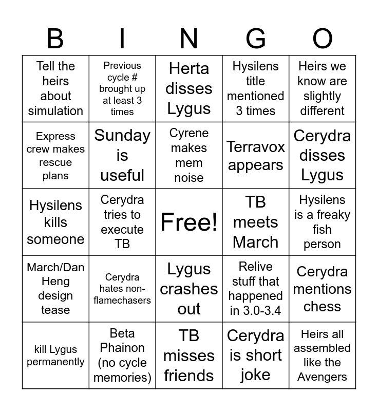 This bingo card has a free space and 24 words: Cerydra hates non-flamechasers, Beta Phainon (no cycle memories), Cyrene makes mem noise, kill Lygus permanently, Heirs we know are slightly different, Tell the heirs about simulation, Express crew makes rescue plans, Previous cycle # brought up at least 3 times, TB meets March, Lygus crashes out, Terravox appears, Hysilens kills someone, Relive stuff that happened in 3.0-3.4, Cerydra mentions chess, Sunday is useful, Cerydra is short joke, Hysilens is a freaky fish person, Herta disses Lygus, Cerydra disses Lygus, Cerydra tries to execute TB, Heirs all assembled like the Avengers, March/Dan Heng design tease, Hysilens title mentioned 3 times and TB misses friends.