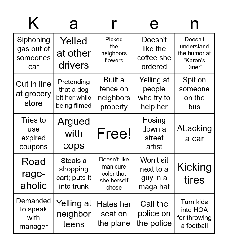 This bingo card has a free space and 28 words: Kicking tires, Yelling at neighbor kids, Yelling at people who try to help her, Call the police on the police, Cut in line at grocery store, Picked the neighbors flowers, Yelled at other drivers, Road rage-aholic, Hosing down a street artist, Demanded to speak with manager, Tries to use expired coupons, Doesn't like the coffee she ordered, Yelling at neighbor teens, Hates her seat on the plane, Spit on someone on the bus, Yelling at neighbor adults, Steals a shopping cart; puts it into trunk, Pretending that a dog bit her while being filmed, Built a fence on neighbors property, Doesn't like manicure color that she herself chose, Siphoning gas out of someones car, Pretends she was attacked & is hurt, Turn kids into HOA for throwing a football, Argued with cops, Attacking a car, Won't sit next to a guy in a maga hat, Doesn't understand the humor at "Karen's Diner" and Very, very bad language.