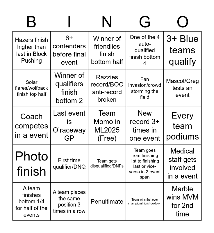 This bingo card has a free space and 24 words: First time qualifier/DNQ, A team places the same position 3 times in a row, Razzies record/BOC anti-record broken, A team finishes bottom 1/4 for half of the events, 3+ Blue teams qualify, Hazers finish higher than last in Block Pushing, Solar flares/wolfpack finish top half, 6+ contenders before final event, New record 3+ times in one event, Team gets disqualified/DNFs, Fan invasion/crowd storming the field, Coach competes in a event, Team goes from finishing 1st to finishing last or vice-versa in 2 event span, Medical staff gets involved in a event, Winner of qualifiers finish bottom 2, Team wins first ever championship/showdown, Every team podiums, Winner of friendlies finish bottom half, Mascot/Greg tests an event, Last event is O’raceway GP, Marble wins MVM for 2nd time, Photo finish, One of the 4 auto-qualified finish bottom 4 and Penultimate.