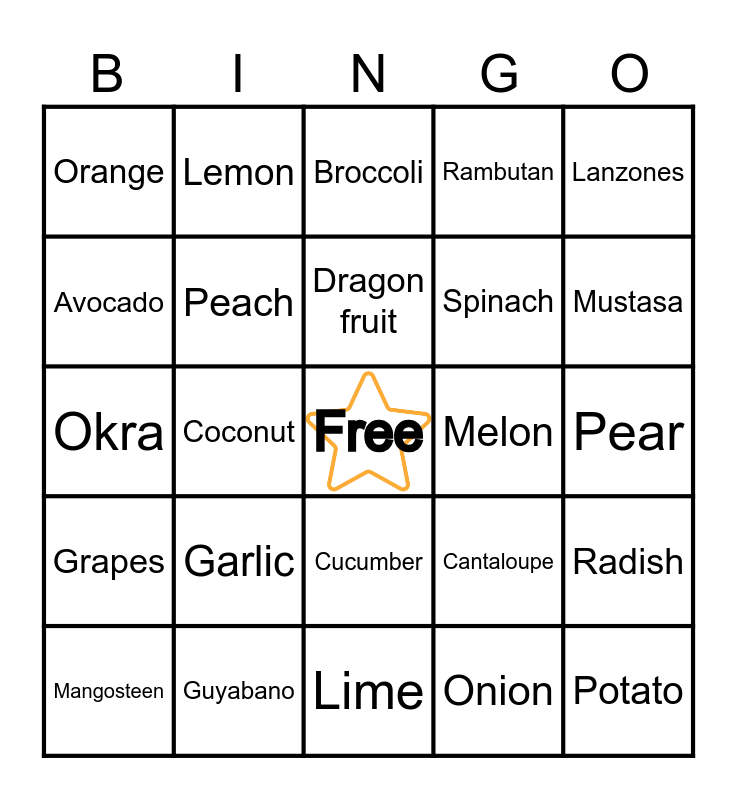 This bingo card has a free space and 73 words: Apple, Banana, Orange, Mango, Pineapple, Papaya, Grapes, Watermelon, Cantaloupe, Strawberry, Blueberry, Cherry, Peach, Pear, Guava, Lemon, Lime, Avocado, Tomato, Melon, Dragon fruit, Rambutan, Lanzones, Santol, Mangosteen, Calamansi, Durian, Jackfruit, Star apple, Tamarind, Guyabano, Lychee, Sineguelas, Passion fruit, Coconut, Pomelo, Plum, Carrot, Potato, Sweet potato, Onion, Garlic, Ginger, Cabbage, Lettuce, Spinach, Broccoli, Cauliflower, Eggplant, Okra, Bitter gourd, Squash, Chayote, Green beans, String bean, Bell pepper, Chili pepper, Cucumber, Tomato, Corn, Peas, Kangkong, Malunggay, Mustasa, Upo, Patola, Taro, Yam, Radish, Bok choy, Pechay, Leeks and Celery.