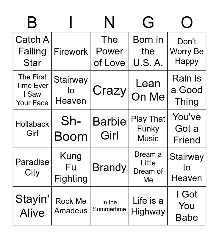 This bingo card has 45 words: El Paso, Barbie Girl, U Can't Touch This, Stayin' Alive, Hooked On A Feeling, Life is a Highway, The Power of Love, Kokomo, Don't Worry Be Happy, Rock Me Amadeus, Born in the U.S. A., Play That Funky Music, Brandy, Kung Fu Fighting, Land of 1000 Dances, In the Summertime, Walking on Sunshine, Hollaback Girl, People Are Crazy, Rain is a Good Thing, Firework, Why Don't We Just Dance, When I Fall in Love, Catch A Falling Star, What the World Needs Now, You've Got a Friend, Bridge Over Troubled Water, Blowin' in the Wind, Dream a Little Dream of Me, Paradise City, Smoke on the Water, Stairway to Heaven, There's a Kind of Hush, Somethin' Stupid, Fly Me to the Moon, Sh-Boom, The Way You Look Tonight, You Make Me Feel Like a Natural Woman, I Got You Babe, Crazy, The First Time Ever I Saw Your Face, Lean On Me, Everything She Ain't, Stairway to Heaven and Boys Back Home.