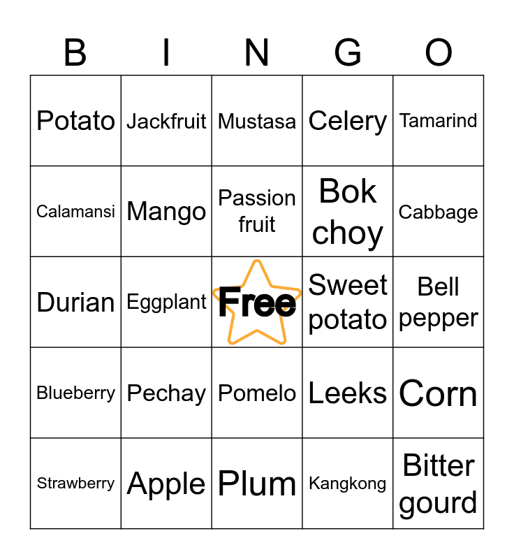 This bingo card has a free space and 61 words: Garlic, Apple, Cucumber, Blueberry, Kangkong, Okra, Mango, Rambutan, Bok choy, Dragon fruit, Celery, Onion, Calamansi, Guava, Tomato, Potato, Bitter gourd, Tamarind, Malunggay, Passion fruit, Sweet potato, Mustasa, Strawberry, Corn, Cauliflower, Taro, Carrot, Spinach, Cabbage, Peach, Santol, Watermelon, Banana, Lettuce, Jackfruit, Avocado, Chayote, Eggplant, Mangosteen, Durian, Pear, Pechay, Bell pepper, Lemon, Leeks, Green beans, Chili pepper, Star apple, Grapes, Pomelo, Plum, Yam, Sineguelas, Orange, Cherry, Patola, Guyabano, Upo, String bean, Lychee and Lime.