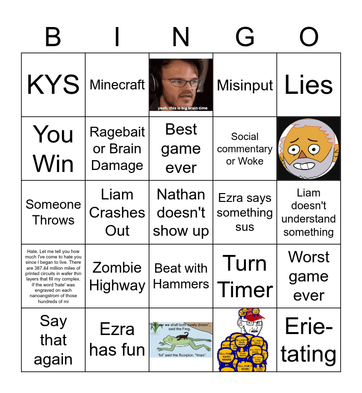 This bingo card has 5 images, a free space and 24 words: Say that again, The design is very human, Liam Crashes Out, Sasha Crashes Out, KYS, Ragebait or Brain Damage, Zombie Highway, Ezra says something sus, Ezra has fun, Liam doesn't understand something, Erie-tating, Cardio, Beat with Hammers, Hate. Let me tell you how much I've come to hate you since I began to live. There are 387.44 million miles of printed circuits in wafer thin layers that fill my complex. If the word 'hate' was engraved on each nanoangstrom of those hundreds of mi, Lies, Someone Throws, Turn Timer, Born too late to fight in rabbit clearing etc, Social commentary or Woke, You Win, Misinput, Minecraft, Worst game ever and Best game ever.