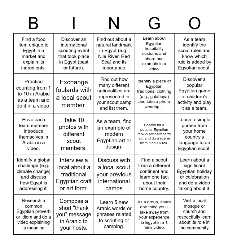 This bingo card has 25 words: Interview a local about a traditional Egyptian craft or art form., Learn 5 new Arabic words or phrases related to scouting or camping., Find out how many different nationalities are represented in your scout camp and list them., Research a common Egyptian proverb or idiom and do a video explaining its meaning., As a team identify the scout rules and know which rule is added by Egyptian scout., Find a food item unique to Egypt in a market and explain its ingredients., Practice counting from 1 to 10 in Arabic as a team and do it in a video., Discover an international scouting event that took place in Egypt (past or future)., Search for a popular Egyptian movie/series/theatre act and do a scene from it on TikTok., Discuss with a local scout your previous international camps, Identify a piece of Egyptian traditional clothing (e.g., galabeya) and take a photo wearing it., Have each team member introduce themselves in Arabic in a video., Find a scout from a different continent and learn one fact about their home country., Learn about a significant Egyptian holiday or celebration and do a video talking about it., Exchange foulards with a local scout member., Visit a local mosque or church and respectfully learn about its role in the community., Teach a simple phrase from your home country's language to an Egyptian scout., Find out about a natural landmark in Egypt (e.g., Nile River, Red Sea) and its importance., Discover a popular Egyptian game or children's activity and play it as a team., Take 10 photos with different scout members., As a team, find an example of modern Egyptian art or design., Compose a short "thank you" message in Arabic to your hosts., Identify a global challenge (e.g. climate change) and discuss how Egypt is addressing it., Learn about Egyptian hospitality customs and share one example in a video. and As a group, share one thing you'll take away from your experience in Egypt in a 1 mins video..