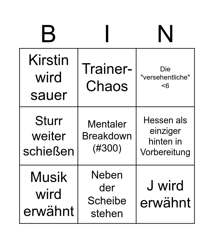 This bingo card has a free space and 8 words: Hessen als einziger hinten in Vorbereitung, Die "versehentliche" <6, Trainer-Chaos, Musik wird erwähnt, Kirstin wird sauer, J wird erwähnt, Sturr weiter schießen and Neben der Scheibe stehen.