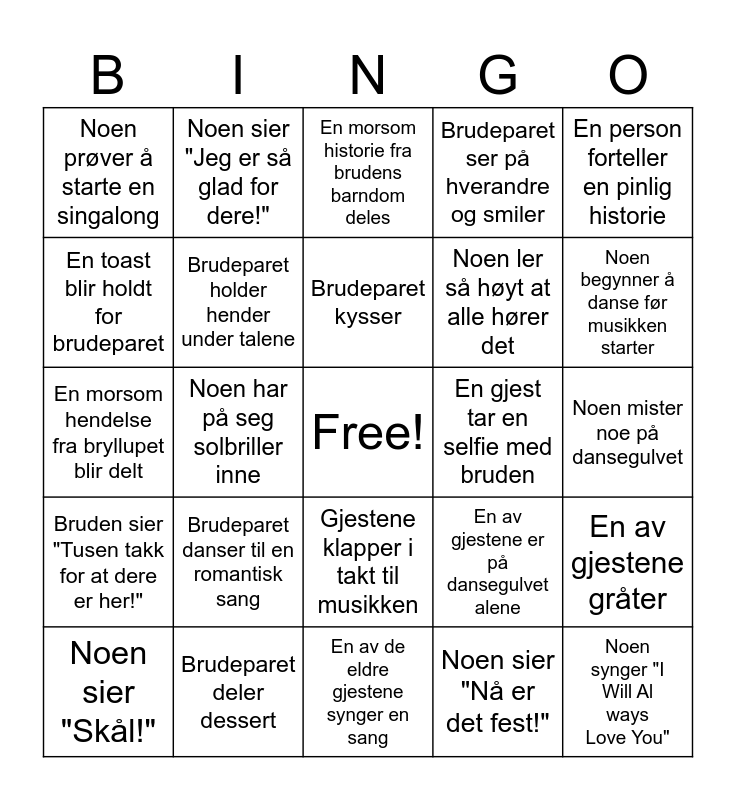 This bingo card has a free space and 24 words: Brudeparet danser til en romantisk sang, Brudeparet deler dessert, Brudeparet kysser, Noen sier "Skål!", En person forteller en pinlig historie, Noen prøver å starte en singalong, En toast blir holdt for brudeparet, Noen sier "Jeg er så glad for dere!", En gjest tar en selfie med bruden, Gjestene klapper i takt til musikken, Noen ler så høyt at alle hører det, En morsom hendelse fra bryllupet blir delt, En av gjestene er på dansegulvet alene, En av gjestene gråter, Brudeparet holder hender under talene, Noen sier "Nå er det fest!", Noen mister noe på dansegulvet, En morsom historie fra brudens barndom deles, Noen begynner å danse før musikken starter, Noen har på seg solbriller inne, Noen synger "I Will Always Love You", Bruden sier "Tusen takk for at dere er her!", Brudeparet ser på hverandre og smiler and En av de eldre gjestene synger en sang.