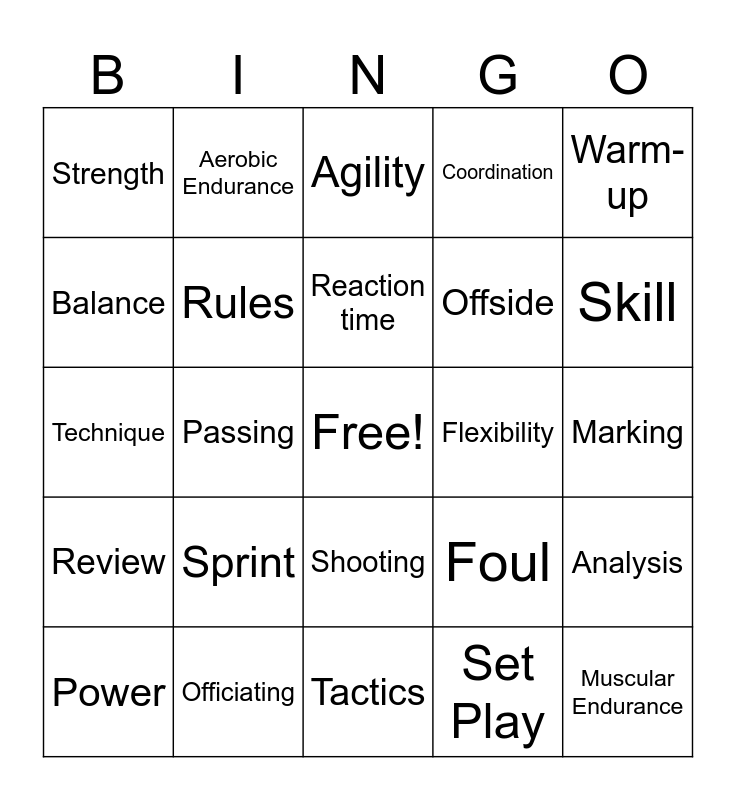 This bingo card has a free space and 30 words: Officiating, Dribbling, Passing, Scoring System, Strength, Agility, Rules, Shooting, Flexibility, Tactics, Marking, Muscular Endurance, Set Play, Weakness, Skill, Teamwork, Foul, Review, Sprint, Warm-up, Technique, Goal, Aerobic Endurance, Offside, Balance, Coordination, Analysis, Power, Reaction time and Defence.