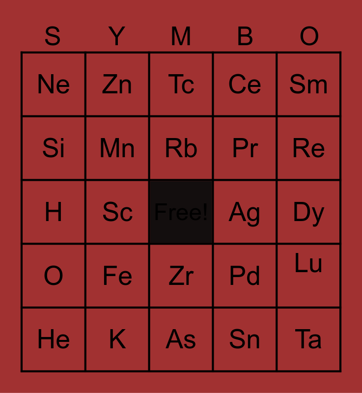 This bingo card has a free space and 24 words: He, Fe, Rb, Sn, Sm, Ne, Zn, Tc, Ag, Dy, H, Mn, Pd, Lu, Si, K, As, Ce, Re, O, Sc, Zr, Pr and Ta.