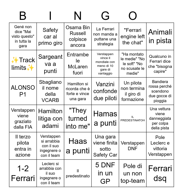 This bingo card has 58 words: Una macchina non McLaren vince, Hamas a punti, Gené urla "Che striccia nera!", Vanzini confonde due piloti, Una vettura viene danneggiata per colpa della pista, Gené sbaglia un congiuntivo, ✨Track limits✨, Daddy Alonso si lamenta con un altro pilota, Entrambe le McLaren fuori, La Ferrari manda a puttane una strategia, La Ferrari non manda a puttane una strategia, Leclerc conclude una gara senza sfighe, 1-2 Ferrari, Pole Leclerc e vittoria Verstappen, Problemi problemi problemihhhh, Gené non dice "Mai visto questo" in tutta la gara, ALONSO P1, "Ferrari engine left the chat", Ferrari sbaglia un pit-stop, Sargeant va a punti, Sbagliano il nome della VCARB, Osama Bin Russell colpisce ancora, "They turned into me", Hamilton litiga con adami, Verstappen vince con 30s di vantaggio, Hamilton si ricorda che è forte e vince una gara, Una gara viene finita sotto Safety Car, Si completa una gara senza l'entrata della Safety Car, Verstappen vince il mondiale con meno di 10 gare di vantaggio, Il predestinato, Verstappen dnf, Ferrari dsq, Chioppo greve, Russel e verstappen si distruggono a vicenda, Verstappen si arrabbia con il suo ingegnere o con il team, Leclerc si arrabbia con il suo ingegnere o con il team, Si passa da Safety Car a bandiera rossa, Qualcuno in Ferrari dice che "bisogna capire", "Ha montato le medie" "No le soft" "No no scusate le medie", Vanzini si lamenta con la FOM, Un pilota non termina il giro di formazione, Il terzo pilota entra in azione, Verstappen viene graziato dalla FIA, Xavi non dice "We are checking" per un'intera gara, Una gara supera il limite delle 2 ore, Una gara viene interrotta anticipatamente, Si fa più di un giro di formazione, Bandiera rossa perché scendono due gocce di pioggia, IL PREDESTINATOH, Mattarella va a far scena in un GP italiano, Pole di un non top-team, Haas a punti, Verstappen DNF, 5 DNF in un GP, Safety car al primo giro, Giro veloce della gara non RedBull, Animali in pista and Un non top-team è in testa per un giro.