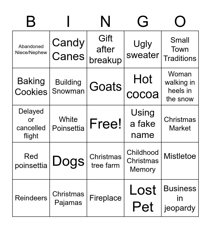 This bingo card has a free space and 24 words: Reindeers, Dogs, Goats, Lost Pet, Small Town Traditions, Abandoned Niece/Nephew, Candy Canes, Gift after breakup, Using a fake name, Christmas Market, Delayed or cancelled flight, Building Snowman, Childhood Christmas Memory, Mistletoe, Baking Cookies, Christmas Pajamas, Fireplace, Ugly sweater, Woman walking in heels in the snow, Red poinsettia, White Poinsettia, Christmas tree farm, Hot cocoa and Business in jeopardy.