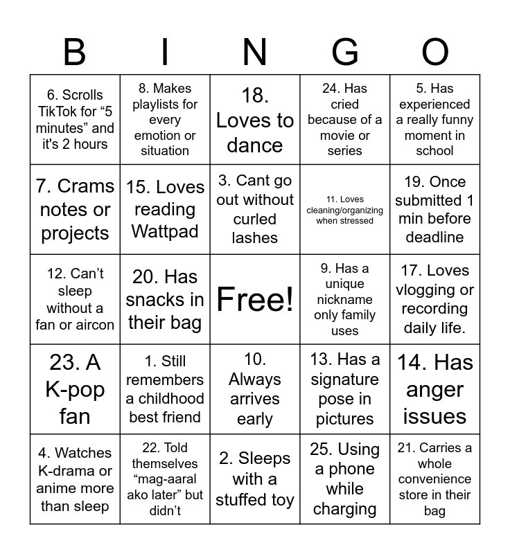 This bingo card has a free space and 25 words: 1. Still remembers a childhood best friend, 2. Sleeps with a stuffed toy, 3. Cant go out without curled lashes, 4. Watches K-drama or anime more than sleep, 5. Has experienced a really funny moment in school, 6. Scrolls TikTok for “5 minutes” and it's 2 hours, 7. Crams notes or projects, 8. Makes playlists for every emotion or situation, 9. Has a unique nickname only family uses, 10. Always arrives early, 11. Loves cleaning/organizing when stressed, 12. Can’t sleep without a fan or aircon, 13. Has a signature pose in pictures, 14. Has anger issues, 15. Loves reading Wattpad, 16. Can travel alone, 17. Loves vlogging or recording daily life., 18. Loves to dance, 19. Once submitted 1 min before deadline, 20. Has snacks in their bag, 21. Carries a whole convenience store in their bag, 22. Told themselves “mag-aaral ako later” but didn’t, 23. A K-pop fan, 24. Has cried because of a movie or series and 25. Using a phone while charging.
