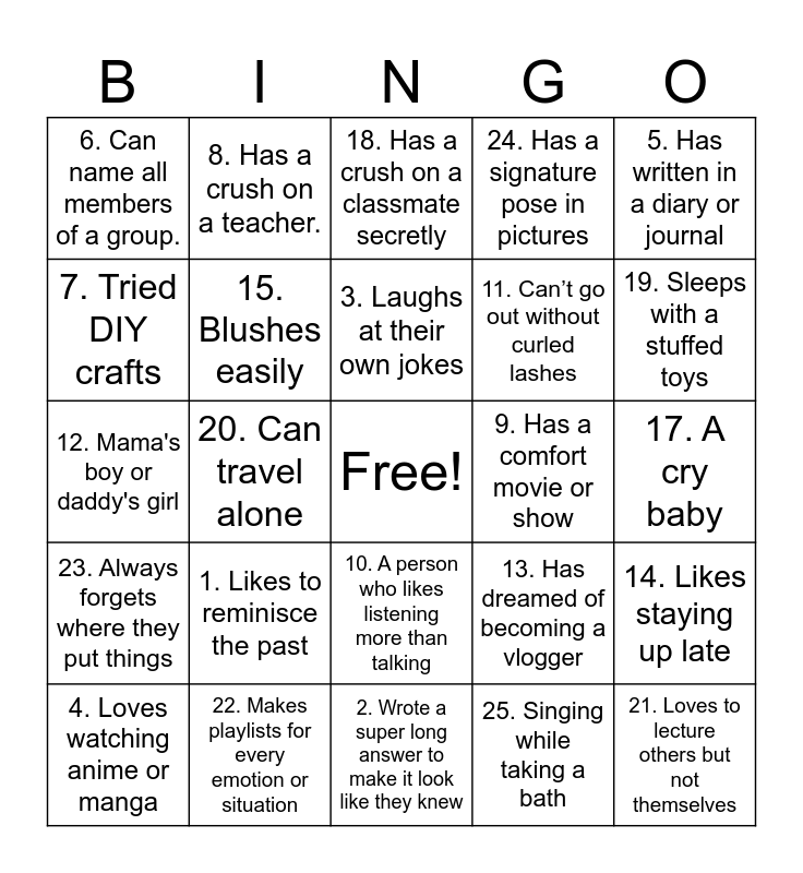 This bingo card has a free space and 25 words: 1. Likes to reminisce the past, 2. Wrote a super long answer to make it look like they knew, 3. Laughs at their own jokes, 4. Loves watching anime or manga, 5. Has written in a diary or journal, 6. Can name all members of a group., 7. Tried DIY crafts, 8. Has a crush on a teacher., 9. Has a comfort movie or show, 10. A person who likes listening more than talking, 11. Can’t go out without curled lashes, 12. Mama's boy or daddy's girl, 13. Has dreamed of becoming a vlogger, 14. Likes staying up late, 15. Blushes easily, 16. Carries a whole convenience store in their bag, 17. A cry baby, 18. Has a crush on a classmate secretly, 19. Sleeps with a stuffed toys, 20. Can travel alone, 21. Loves to lecture others but not themselves, 22. Makes playlists for every emotion or situation, 23. Always forgets where they put things, 24. Has a signature pose in pictures and 25. Singing while taking a bath.