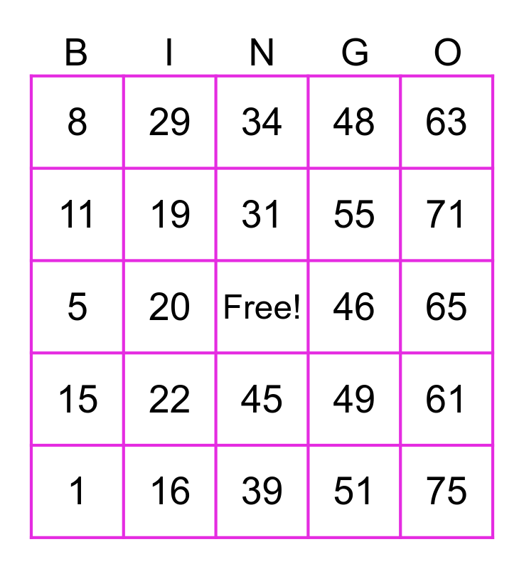 This bingo card has a free space and 24 words: 1, 22, 31, 51, 63, 8, 29, 34, 46, 65, 5, 19, 49, 61, 11, 16, 39, 48, 71, 15, 20, 45, 55 and 75.