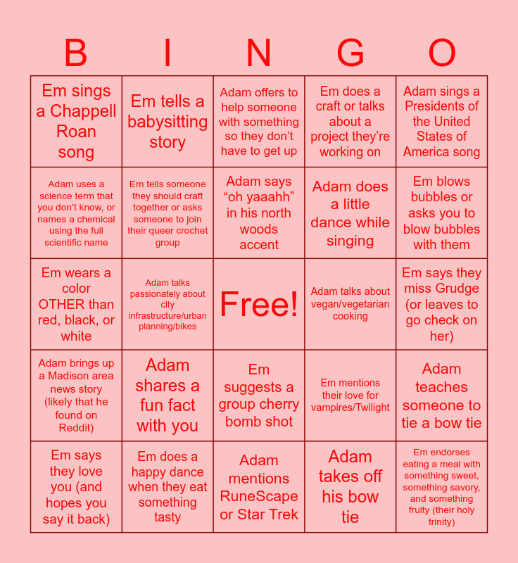 This bingo card has a free space and 24 words: Adam shares a fun fact with you, Em does a happy dance when they eat something tasty, Adam says “oh yaaahh” in his north woods accent, Em says they love you (and hopes you say it back), Adam sings a Presidents of the United States of America song, Em sings a Chappell Roan song, Adam uses a science term that you don’t know, or names a chemical using the full scientific name, Em tells a babysitting story, Adam talks about vegan/vegetarian cooking, Em suggests a group cherry bomb shot, Adam does a little dance while singing, Em wears a color OTHER than red, black, or white, Em mentions their love for vampires/Twilight, Adam teaches someone to tie a bow tie, Em tells someone they should craft together or asks someone to join their queer crochet group, Adam takes off his bow tie, Em says they miss Grudge (or leaves to go check on her), Adam offers to help someone with something so they don’t have to get up, Em blows bubbles or asks you to blow bubbles with them, Adam talks passionately about city infrastructure/urban planning/bikes, Em endorses eating a meal with something sweet, something savory, and something fruity (their holy trinity), Adam brings up a Madison area news story (likely that he found on Reddit), Em does a craft or talks about a project they’re working on and Adam mentions RuneScape or Star Trek.