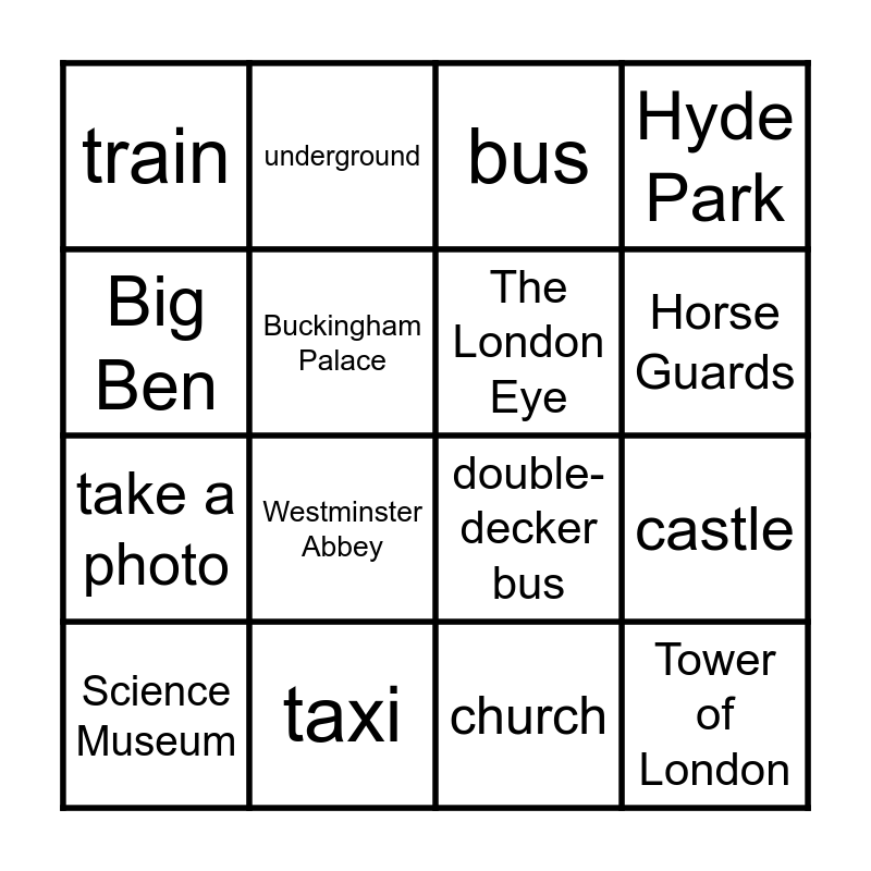 This bingo card has 16 words: taxi, castle, bus, train, take a photo, underground, double-decker bus, church, Big Ben, Buckingham Palace, Science Museum, Hyde Park, Westminster Abbey, Horse Guards, The London Eye and Tower of London.