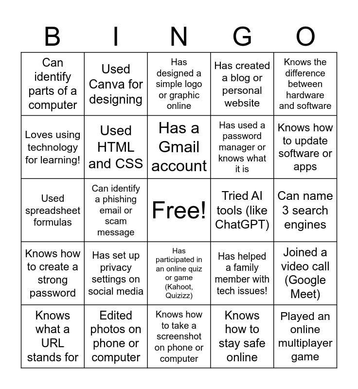 This bingo card has a free space and 24 words: Knows what a URL stands for, Has set up privacy settings on social media, Has a Gmail account, Knows how to stay safe online, Knows the difference between hardware and software, Can identify parts of a computer, Used Canva for designing, Has designed a simple logo or graphic online, Tried AI tools (like ChatGPT), Can name 3 search engines, Used spreadsheet formulas, Used HTML and CSS, Has helped a family member with tech issues!, Joined a video call (Google Meet), Loves using technology for learning!, Edited photos on phone or computer, Knows how to take a screenshot on phone or computer, Has created a blog or personal website, Knows how to update software or apps, Knows how to create a strong password, Can identify a phishing email or scam message, Has participated in an online quiz or game (Kahoot, Quizizz), Has used a password manager or knows what it is and Played an online multiplayer game.