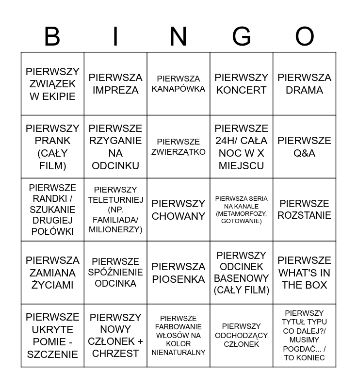 This bingo card has a free space and 24 words: PIERWSZE SPÓŹNIENIE ODCINKA, PIERWSZY NOWY CZŁONEK + CHRZEST, PIERWSZE ZWIERZĄTKO, PIERWSZE UKRYTE POMIE -SZCZENIE, PIERWSZA DRAMA, PIERWSZY ZWIĄZEK W EKIPIE, PIERWSZY PRANK (CAŁY FILM), PIERWSZA IMPREZA, PIERWSZA SERIA NA KANALE (METAMORFOZY, GOTOWANIE), PIERWSZA PIOSENKA, PIERWSZE 24H/ CAŁA NOC W X MIEJSCU, PIERWSZE RANDKI / SZUKANIE DRUGIEJ POŁÓWKI, PIERWSZY ODCINEK BASENOWY (CAŁY FILM), PIERWSZE WHAT'S IN THE BOX, PIERWSZE RZYGANIE NA ODCINKU, PIERWSZY ODCHODZĄCY CZŁONEK, PIERWSZE ROZSTANIE, PIERWSZA KANAPÓWKA, PIERWSZE Q&A, PIERWSZY TELETURNIEJ (NP. FAMILIADA/ MILIONERZY), PIERWSZY TYTUŁ TYPU CO DALEJ?/ MUSIMY POGDAĆ... / TO KONIEC, PIERWSZA ZAMIANA ŻYCIAMI, PIERWSZY KONCERT and PIERWSZE FARBOWANIE WŁOSÓW NA KOLOR NIENATURALNY.